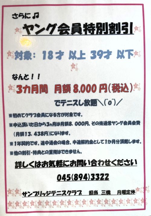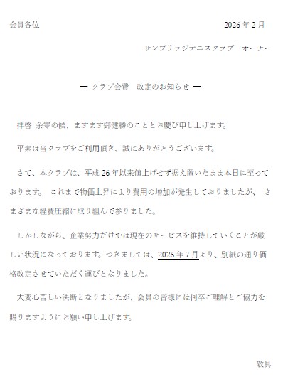 ![]() クラブへのお問い合わせ ↓ sunbridge-tc@jcom.zaq.ne.jp ![]() スクールの欠席・振替・その他 ↓ sunbridge-ts@jcom.zaq.ne.jp 定休日 月曜(祝日の場合営業し翌日休) 冬季休業・夏季休業あり 年末大掃除休業(12/29・30・31) 営業時間 9:00am~日没まで |